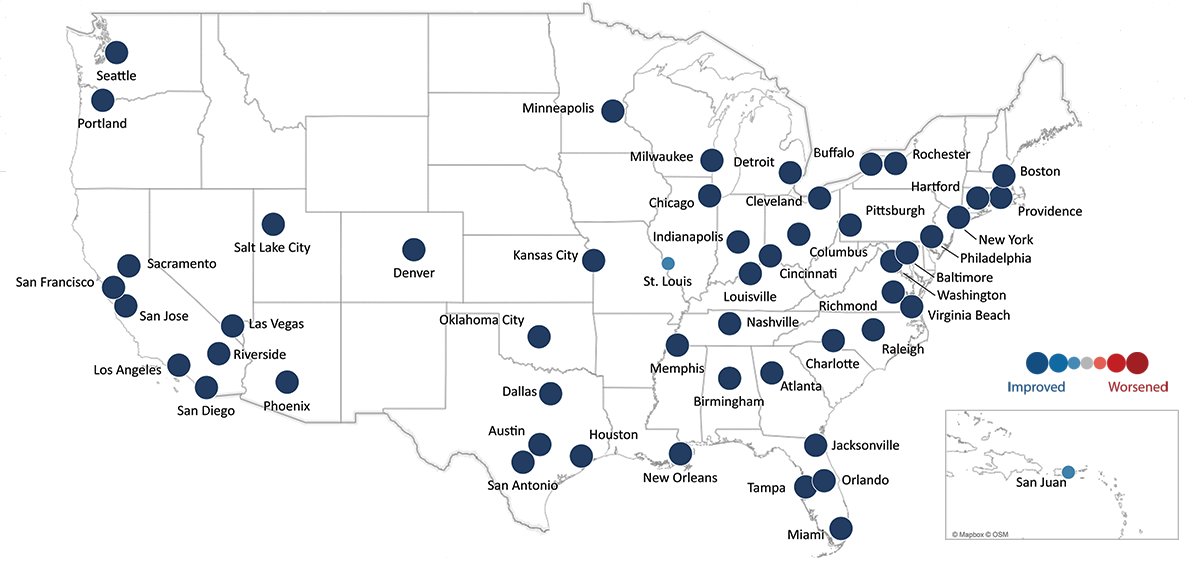 Blue bolded values (with – sign) indicate improving conditions; red italics (with + sign) indicate worsening conditions.